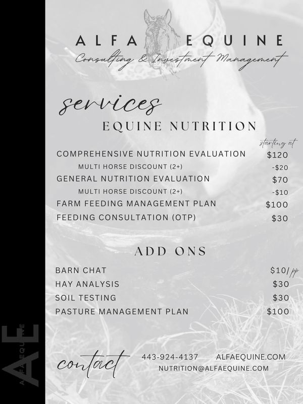 " I had ALFA Equine (Sailor) out to do an evaluation on my horses, one at the time needed weight and muscle and then my other one was just super fat and happy. She was able to help create a diet for both reducing bags in the barn as well as staying in my budget. Under her plan, my skinny gained the weight he needed and my beef cakes has slimmed to a nice weight. I can’t say enough great things! If you need any sort of nutritional assistance with your equine friend, give her a shout! "